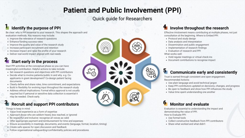 On this web page, we use the term Patient and Public Involvement (PPI) to describe the involvement of patients and members of the public in the research process. This terminology is widely used in the UK and parts of Europe. However, we acknowledge that in other countries, different terms may be preferred. For example, “patient engagement” is commonly used in the United States and Canada, while “consumer and community involvement” is often used in Australia. You may also encounter related terms such as community engagement, stakeholder involvement, or co-production, all of which reflect a shared commitment to involving people with lived experience in research.